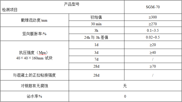 SGM-70高性能水泥基灌浆料是在传统灌浆料的基础上经过多年的发展和实际工程应用后,经过我公司专业技术研发团队结合实际工程应用而研发出的一种特种的、专用的、新型的、精确的、高性能水泥基二次灌浆材料,具有大流动性、微膨胀无收缩、早强高强、耐低温和抗油渗等特点,产品保证在灌浆时能够充分填充灌注空间,并具有复合膨胀双重效应保证设备安装精确定位、结构补强或栽筋锚固等在一天内甚至更短时间内满足需求,大大缩短了施工周期,达到省时、省工、早运转或早承载的技术经济效果,后期的高强度增长可保证设备安装的长久稳固性。优良的技术性能保障了工程应用的安全性,耐久性。