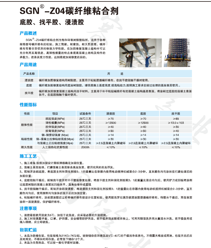产品概述 SG-Z04碳纤维粘合剂为饱和环氧树脂胶粘剂,适用于各种规格型号碳纤维布的粘贴。施工简便、耐腐蚀、耐久性能高。碳纤维布有着非常优异的物理力学性能,在加固修复混凝土结构中可以充分利用其高强度、高弹性模量的特点来提高混凝土结构及构件的承载力,改善其受力性能,达到高效加固修复的目的。