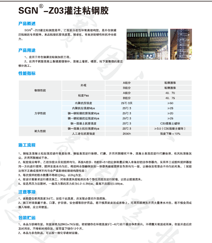 产品概述 SG-Z03灌注粘钢胶是甲、乙双组分改性环氧类结构胶,是外包钢灌注粘钢的专用胶种。本品粘接抗剪强度高、耐老化、有良好的韧性和抗冲击能力。 产品用途 1、应用于外包钢灌注粘钢加固工程。 2、应用于钢筋混凝土裂缝灌缝修补,混凝土墙面、楼面、地下室裂缝的灌注修补施工。