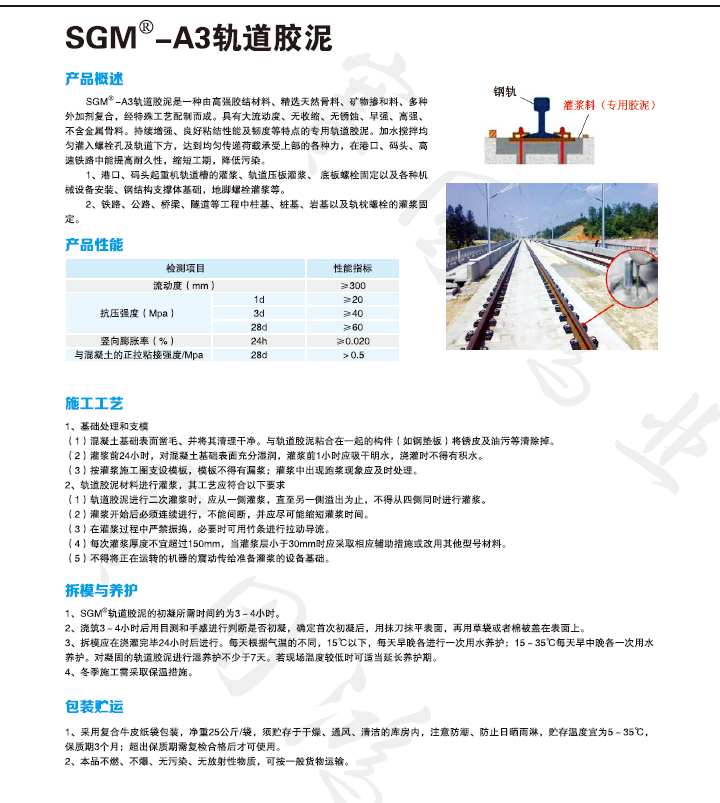 SGM-A3轨道胶泥是一种由高强胶结材料、精选天然骨料、矿物掺和料、多种外加剂复合,经特殊工艺配制而成。具有大流动度、无收缩、无锈蚀、早强、高强、不含金属骨料。持续增强、良好粘结性能及韧度等特点的专用轨道胶泥。加水搅拌均匀灌入螺栓孔及轨道下方,达到均匀传递荷载承受上部的各种力,在港口、码头、高速铁路中能提高耐久性,缩短工期,降低污染。